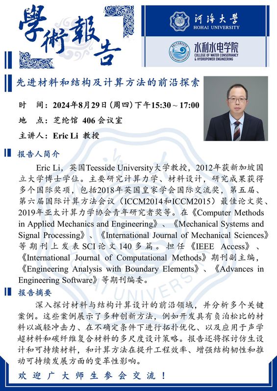 学术报告 | 先进材料和结构及计算方法的前沿探索(英国Teesside University Eric Li )